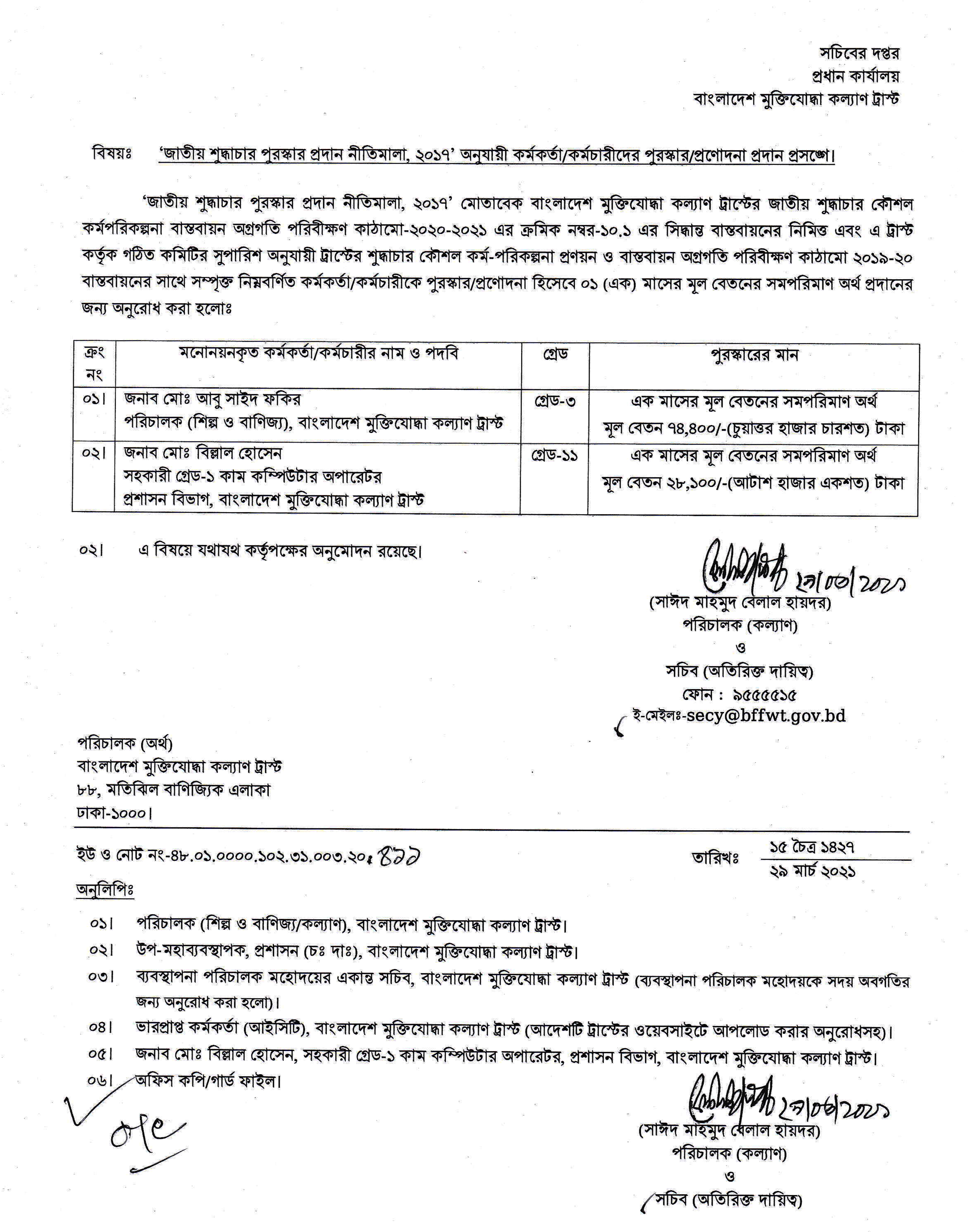 | ২ | জাতীয় শুদ্ধাচার পুরস্কার প্রদান নীতিমালা,২০১৭’ অনুযায়ী কর্মকর্ত/কর্মচারীদের পুরস্কার/প্রণোদনা প্রদান।(২৯-০৩-২০২১) | ১৪-০৪-২০২১ | দেখুন | |