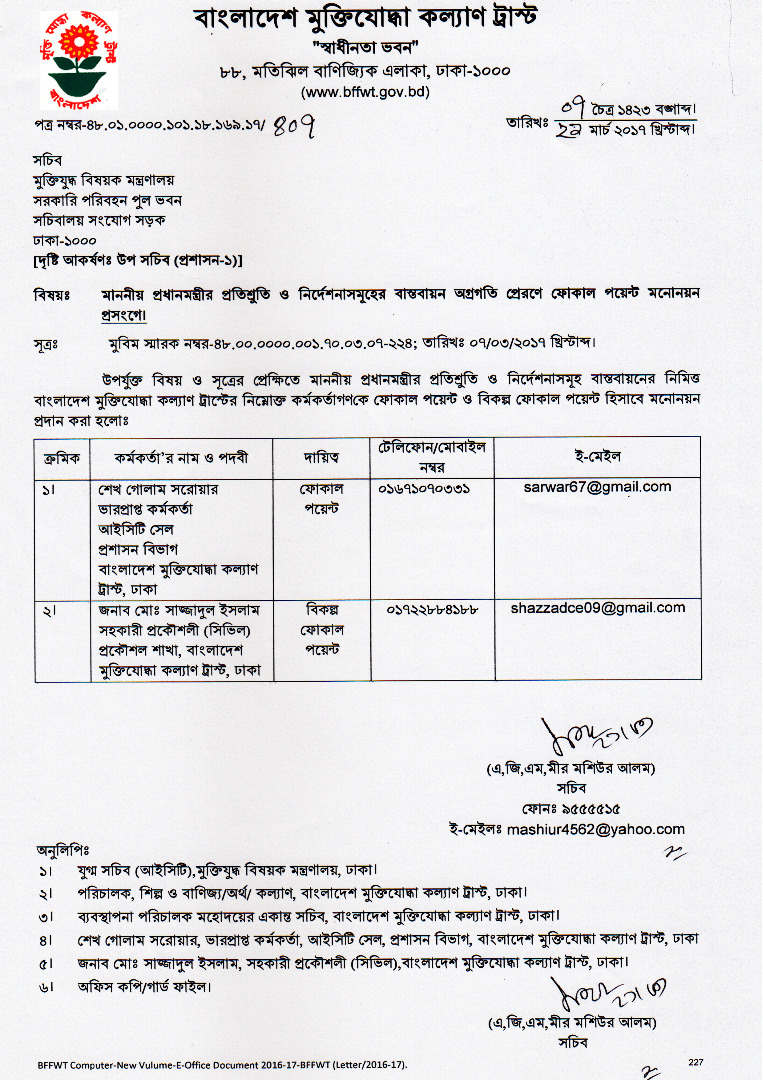 | মার্চ ২০১৭ মাসের সভা | মাননীয় প্রধানমন্ত্রীর প্রতিশ্রুতি ও নির্দেশনাসমূহের বাস্তবায়ন অগ্রগতি প্রেরণে ফোকাল পয়েন্ট ও বিকল্প ফোকাল পয়েন্ট মনোনয়ন সংক্রান্ত আলোচনা। | ট্রাস্টের আইসিটি সেল ও প্রকৌশল শাখা হতে ফোকাল পয়েন্ট এবং বিকল্প ফোকাল পয়েন্ট মনোনয়ন করতে হবে। | ফোকাল পয়েন্ট এবং বিকল্প ফোকাল পয়েন্ট মনোনীত করা হয়েছে। |