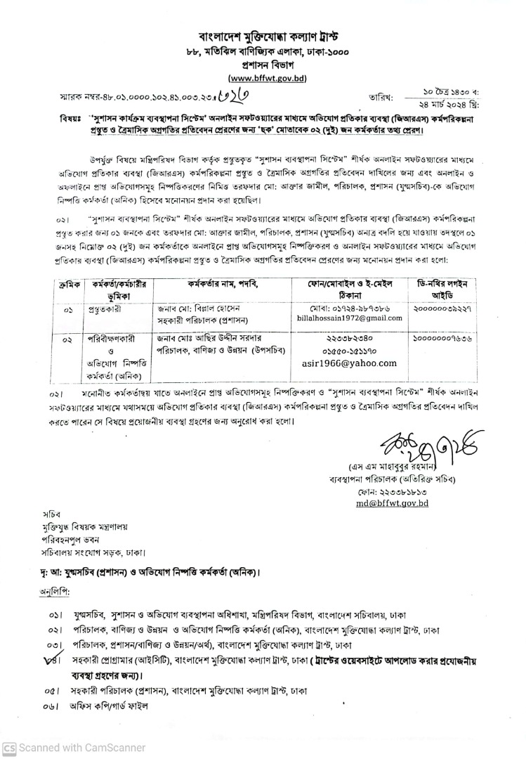 | ৪৫ | ‘সুশাসন কার্যক্রম ব্যবস্থাপনা সিস্টেম’ অনলাইন সফটওয়্যারের মাধ্যমে অভিযোগ প্রতিকার ব্যবস্থা(GRS) প্রস্তুত ও ত্রৈমাসিক অগ্রগতির প্রতিবেদন প্রেরণের জন্য ‘ছক’ মোতাবেক ০২(দুই) জন কর্মকর্তার তথ্য প্রেরণ। |  | | ২৫-০৩-২০২৪ |