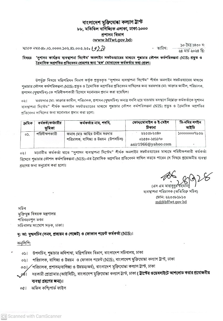| ১ | সুশাসন কার্যক্রম ব্যবস্থাপনা সিস্টেম’ অনলাইন সফটওয়্যারের মাধ্যমে শুদ্ধাচার কৌশল কর্মপরিক্লনা(NIS) প্রস্তুত ও ত্রৈমাসিক অগ্রগতির প্রতিবেদন প্রেরণের জন্য ‘ছক’ মোতাবেক কর্মকর্তার তথ্য প্রেরণ। |  | | ২৫-০৩-২০২৪ |